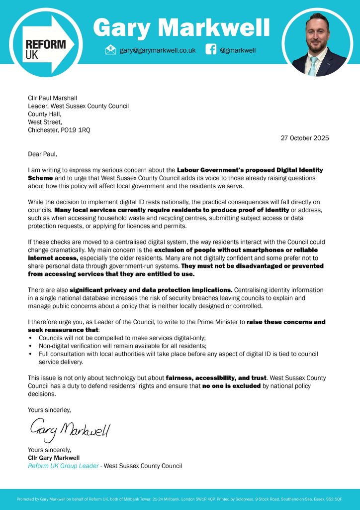 Today Iโve written to West Sussex County Council Leader Paul Marshall to demand that the Council challenges the Labour Governmentโs ๐ฑ๐ฎ๐ป๐ด๐ฒ๐ฟ๐ผ๐๐ ๐๐ถ๐ด๐ถ๐๐ฎ๐น ๐๐ ๐๐ฐ๐ต๐ฒ๐บ๐ฒ.